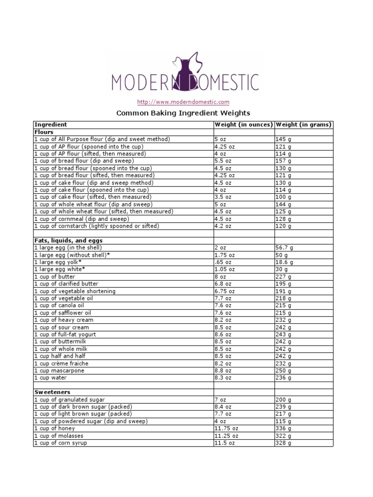 Ingredients Weight Chart Converting common baking ingredients from cups