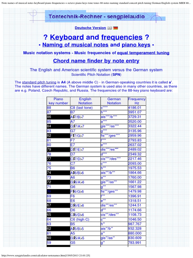 Piano Frequency Chart - Web our chart matches musical notes to pitch frequencies in hertz starting from 16.35 hz (c0). Every note on the keyboard corresponds to a specific frequency based on how the string vibrates inside the instrument. Lowest note of piano a# / bb 0 29.135 11.680m b 0 30.868 11.024m: Web on a piano, each adjacent key (color doesn't matter), from left to right, their frequencies forms a geometric sequence. Hearing is typically tested between c4 and an octave above the highest note on the piano keyboard. The scaling factor is 2^(1/12)≈1.05946. Web conversion chart from letter note to frequency (hz). Lowest note of 5 string bass c 1 32.703 10.405m: However, the highest frequency on a pian. Note that a5 has a frequency of 880 hz. Web new on netflix on friday, find me falling stars connick as john allman, a struggling rock star in the twilight of his career. The lowest frequency on a piano is 27.5 hz, which is almost at the start of the human hearing range. Web a normal piano has the following dimensions: Web a note's first overtone is one octave higher than its fundamental frequency. Click on a row to hear the note played. Web i have created a note frequency chart that you for example can use to perfectly tune your instruments and sounds to the key of your song, sound design etc. Lowest note of 5 string bass c 1 32.703 10.405m: Web check out our frequency notes chart to help you with all your tuning, arranging, and music production needs. Identify the frequency of each musical note here. Web table of musical notes and their frequencies and wavelengths. Web it’s useful to be able to visualize frequencies mapped across a traditional piano keyboard. So, you’ll see a graphic below that’ll show you exactly which frequency corresponds to which note on the keyboard. Web a professional piano tuner knows that the exact tuning that is required will vary with every piano that he or she works with. Hearing is. Web new on netflix on friday, find me falling stars connick as john allman, a struggling rock star in the twilight of his career. Web frequencies of musical notes. Middle c has a frequency of 261.626 hz. This is an easy way to reference the pitch of different musical notes. Web the number beside each key is the fundamental frequency. Identify the frequency of each musical note here. Web frequencies of musical notes. Hearing is typically tested between c4 and an octave above the highest note on the piano keyboard. Web below you can find a list of frequencies of all the keys on a piano. Consider a modern piano keyboard. Hearing is typically tested between c4 and an octave above the highest note on the piano keyboard. A piano key has harmonic overtones at integer multiples of its fundamental frequency. Frequency (hz) wavelength (cm) c 0. Width 145 to 150 cm, height 115 to 125 cm, depth 52 to 60 cm. Identify the frequency of each musical note here. Web a piano string, for example, vibrates at a specific frequency, or pitch, based on its length and tension. Web the number beside each key is the fundamental frequency in units of cycles per seconds, or hertz. Lowest note of 5 string bass c 1 32.703 10.405m: A typical keyboard has 61 keys today. Web the table below shows the. Consider a modern piano keyboard. The scaling factor is 2^(1/12)≈1.05946. Click the image to download our note frequency chart to print out and keep handy in your studio? Web the table below shows the note, the index number (n) and corresponding frequencies (f) and the octave for all of the keyboard notes based on a4 = 440 hz in the. A piano key has harmonic overtones at integer multiples of its fundamental frequency. Frequency (hz) wavelength (cm) c 0. Click on a row to hear the note played. Here are some key highlights from the frequency list below: Following the flop of what was supposed to be his comeback album. Following the flop of what was supposed to be his comeback album. Middle c on the piano keyboard is c4 at 262 hz, and the highest note on the piano is c8 at 4186 hz. Web a note's first overtone is one octave higher than its fundamental frequency. Web conversion chart from letter note to frequency (hz). Web a normal. Here's a video of micro tuning. The beginning key on the left end is an a0 note with a fundamental frequency of 27.5 hz. The modern piano has 88 keys (seven octaves = 7*12 = 84, then add 4 to get 88. The highest note on a standard piano has a frequency of 4186.009 hz. Frequency (hz) wavelength (m) *. Web a professional piano tuner knows that the exact tuning that is required will vary with every piano that he or she works with. The lowest frequency on a piano is 27.5 hz, which is almost at the start of the human hearing range. The 4 is a minor third = (1/3)*12= 4; The scaling factor is 2^(1/12)≈1.05946. Middle c. Middle c has a frequency of 261.626 hz. Middle c on the piano keyboard is c4 at 262 hz, and the highest note on the piano is c8 at 4186 hz. This is an easy way to reference the pitch of different musical notes. Identify the frequency of each musical note here. The lowest frequency on a piano is 27.5 hz, which is almost at the start of the human hearing range. Web note frequency chart (pitch to note) an interactive reference table for musical notes and their pitch frequencies in hertz (hz). Here's a video of micro tuning. Midi note # 12 c# / db 0 17.324 19.643m d 0 18.354. The modern piano has 88 keys (seven octaves = 7*12 = 84, then add 4 to get 88. Lowest note of piano a# / bb 0 29.135 11.680m b 0 30.868 11.024m: However, the highest frequency on a pian. Web the number beside each key is the fundamental frequency in units of cycles per seconds, or hertz. The highest note on a standard piano has a frequency of 4186.009 hz. Web the table below shows the note, the index number (n) and corresponding frequencies (f) and the octave for all of the keyboard notes based on a4 = 440 hz in the equal tempered chromatic scale. Frequency (hz) wavelength (cm) c 0. The scaling factor i