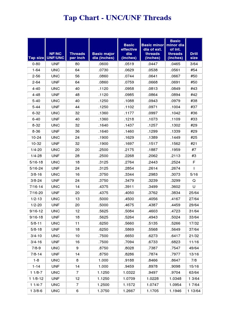 Web Unf Thread Chart (Unified Inch Screw Fine Thread Dimensions, Sizes, Diameters) Thread (In) Threads Per Inch (Tpi) Major Diameter.